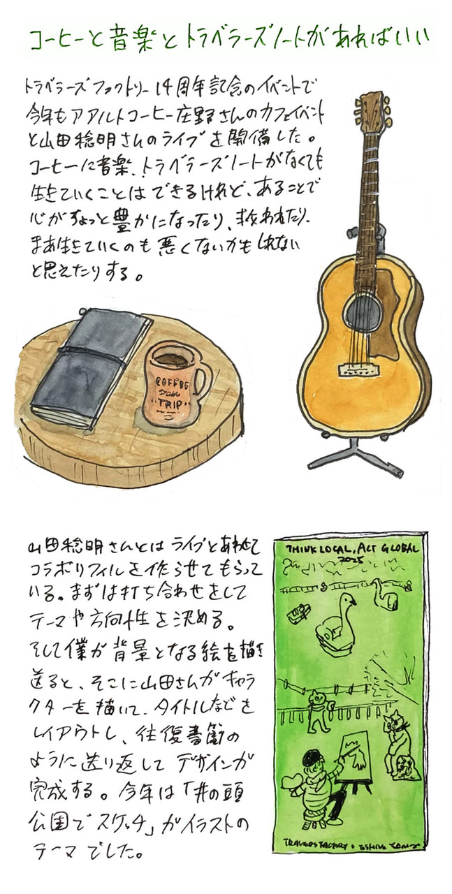 週末は、トラベラーズファクトリー14周年記念のイベントとして、土曜日にはアアルトコーヒー庄野さんのカフェイベント、日曜日には山田稔明さんのライブを開催した。トラベラーズファクトリーが14年続いて、このイベントも欠かすことのできない定例イベントのようになっている。毎年、この時期にお二人がトラベラーズファクトリーに来てくれて、庄野さんはコーヒーを淹れて、山田さんは歌をうたってくれて、さらにそれを楽しみに来てくれるお客さんが来てくれる。そんな2日間も、僕にとってはまさに生きる糧みたいなものになっている。それが14年も続いているのが嬉しい。