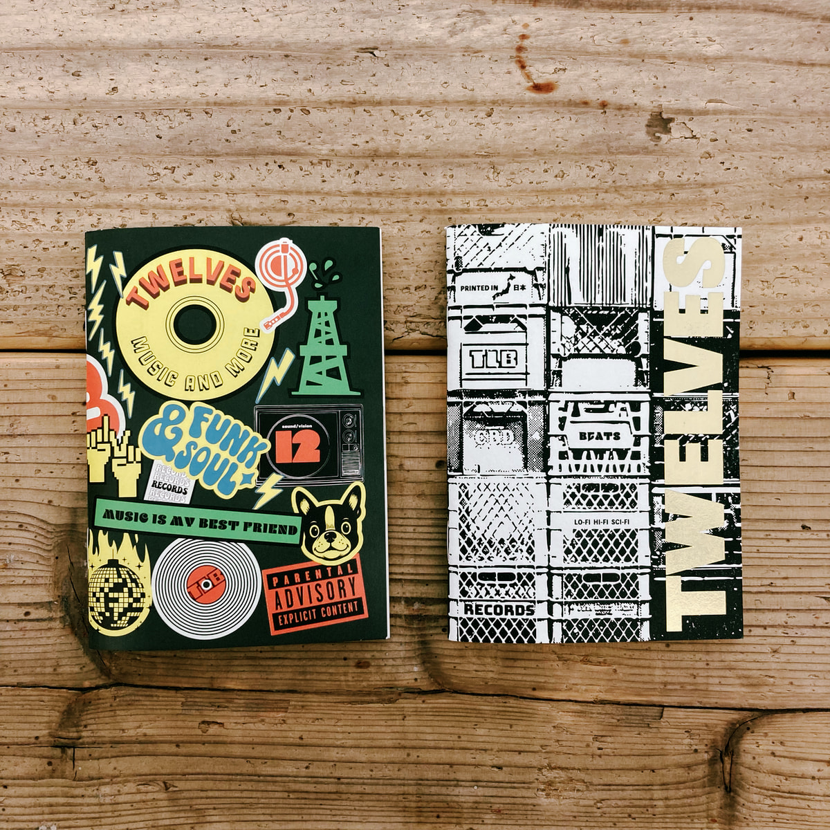 さっそく届いたデザインは、レコードショップらしいポップなイラストが散りばめられたものと、ミルククレート(牛乳を運ぶカートンケースなんだけど、レコードショップでレコードを入れるボックスとしてよく使われている)が並んだモノクロのグラフィックの2種類。どちらか気に入った方でリフィルを作ってほしいと言われたけれど、どちらもステキだったので両方作ることにした。ポップなイラストのデザインの表紙は、オフセット印刷、モノクロのデザインは活版印刷で表現し、TWELVES の文字はゴールドの箔押しで表現することにした。