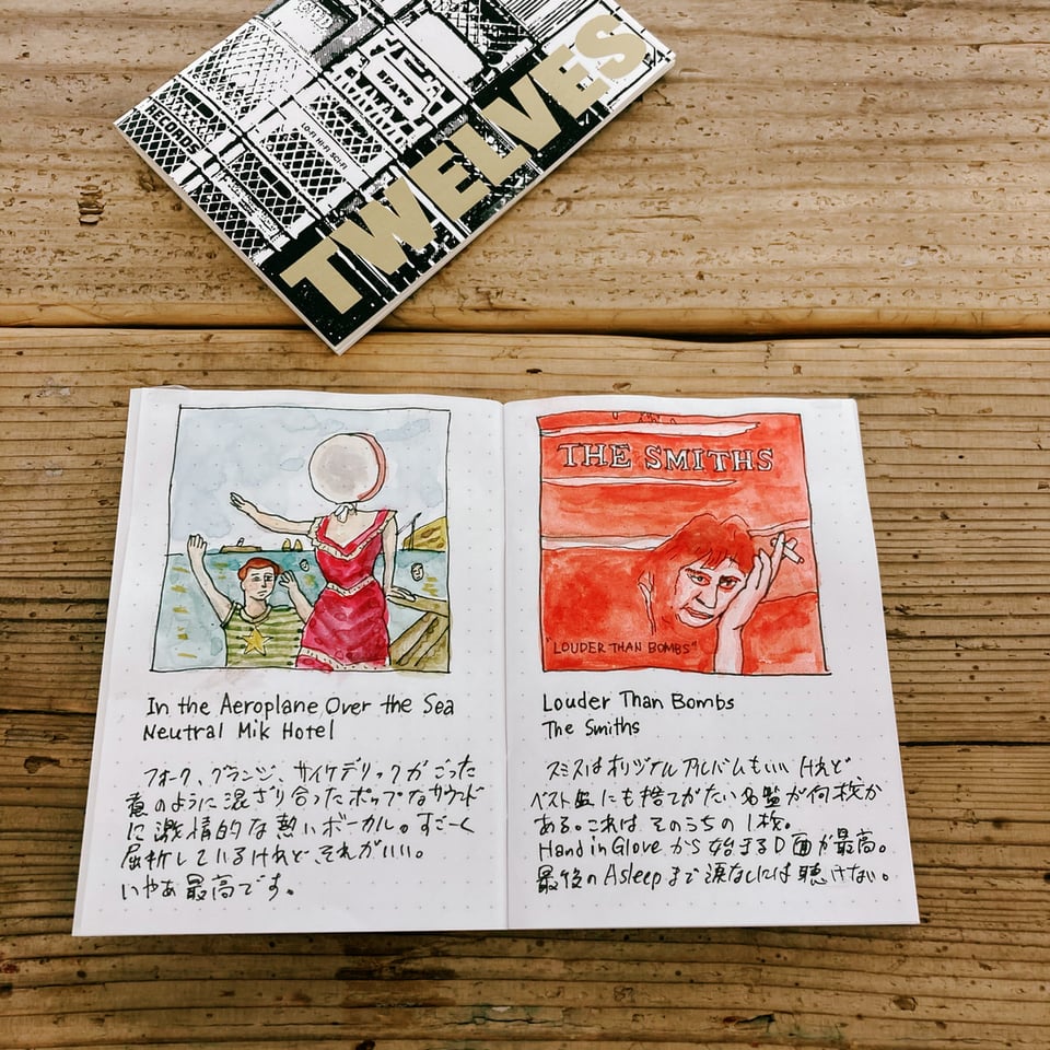ちなみに左のページに描いたのは、ニュートラル・ミルク・ホテルの「In the Aeroplane Over the Sea」。1990年代にリリースされたカルト的人気の名盤だ。そういえば、僕はこのレコードを2014年の6月に訪れたポートランドの独立系レコードショップで手に入れている。そして、その年の7月にオープンしたトラベラーズファクトリーエアポートのディスプレイに使った。ちょっと分かりづらい場所にあるのだけど、今でもこのレコードは店内で飾られている(だから、実際に針を落として聴いたのは一回しかない)。