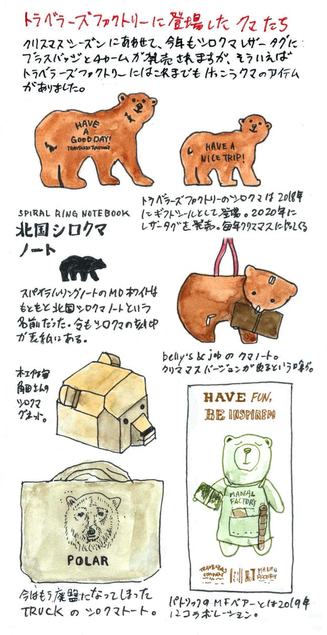 そういえば、あらためて店内を眺めてみると、スパイラルリングノートのMDホワイトにはシロクマの刻印が押されているし、benlly's & jobのクマシャケにクマノートもある。毎年開催している「手作りの道具たち展」では木工作家の角田さんのシロクマグネットが定番だし、前にはLOG-ONとのコラボで、パトリックによりマニュアルファクトリーベアのリフィルやチャームも作った。トラベラーズファクトリーには、クリスマスのシロクマ以外にもけっこうクマが登場しているのだ。
