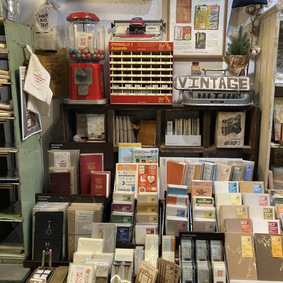 2階は雑貨コーナーのようになっていて、その奥にはトラベラーズノートのコーナーがあった。ヴィンテージの家具や什器を使って丁寧に素敵に並べられている。僕は嬉しくなって、そこにいた女性スタッフに「私たち、トラベラーズノートの会社のものなんですが、写真を撮っていいですか?」と声をかけると、「もちろんです」と笑顔で答えてくれた。