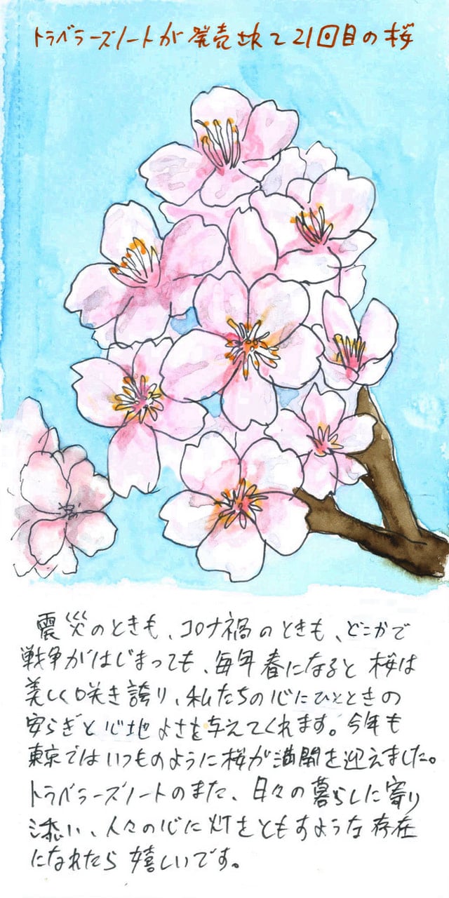 そんな中でも、今年も桜は美しく咲き、私たちの心に安らぎと心地よさを与えてくれます。そして、トラベラーズノートは20周年記念の年です。国内外でイベントを計画中です。トラベラーズノートもまた日々の暮らしに寄り添い、人々の心に灯をともすような存在でありたいと考えています。世界を少しでも良くするには、そんなささやかなことを積み重ねることが大切だと信じています。