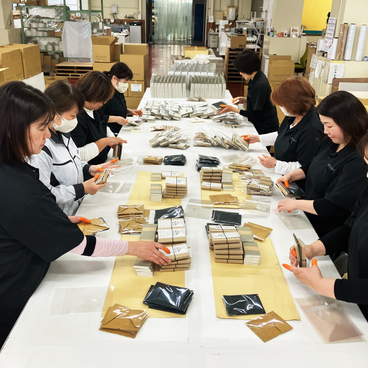 先日、流山工場へ行ってきた。工場ではちょうど今月に発売する「トラベラーズノート カードサイズ 20周年セット」のアッセンブリの真っ最中だった。作業テーブルの上に、カードサイズのトラベラーズノートをはじめ、クラフトファイルやジッパーケースなどを並べて、スタッフが箱に詰めていた。