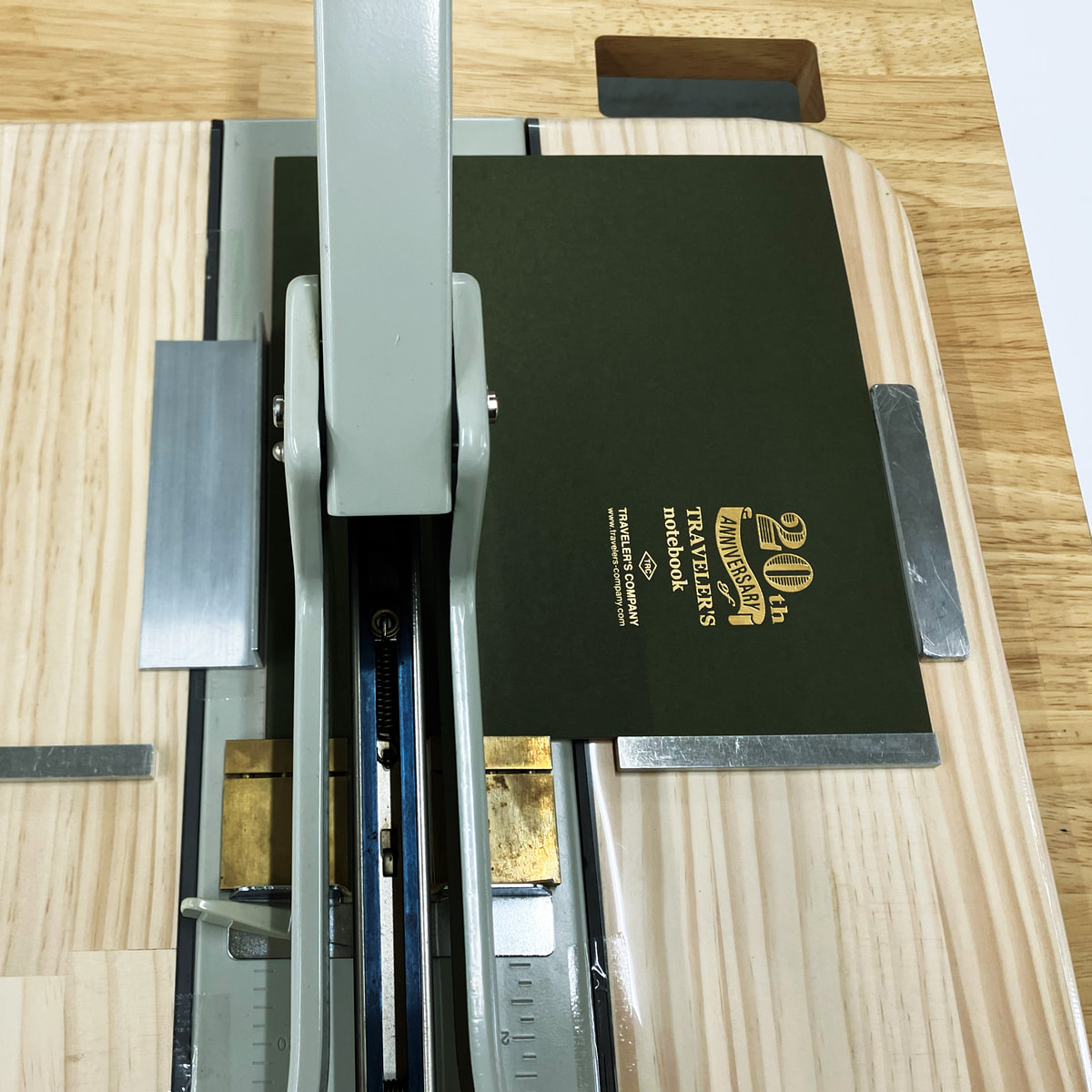 その横では、別のスタッフがリフィルの表紙の紙に20周年ロゴを箔押ししている。これは、事前に頼んでおいた「DIY TRAVELER’S notebook!」のためのサンプルの表紙だ。白い紙にブルーの箔押し、深い緑色の紙にゴールド、薄いピンクの紙にはピスタチオグリーンの箔など、さまざまな色の紙にさまざまな箔が押されている。うん。いい感じだ。