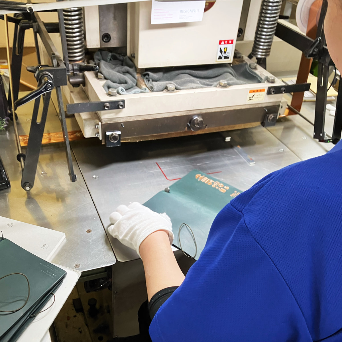 箔押し機の前に行くと、ちょうどトラベラーズノート KYOTO EDITIONの表紙の加工をしていた。ブルーのカバーを一枚ずつ手に取って、丁寧にカッパーの箔を押していく。ちょうど桜の季節だったこともあって、トラベラーズファクトリー京都にも、世界中からたくさんの方が足を運んでくれている。タイのチェンマイから届いた革カバーが流山工場で加工されて京都に送られる。そこで旅人たちの手に渡り、世界中に旅立っていく。そんなノートの旅に思いを馳せた。