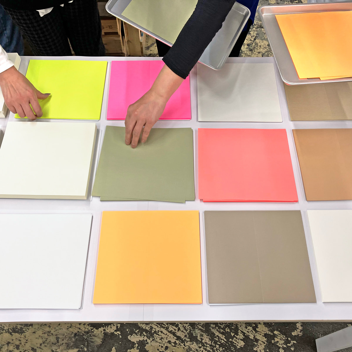 早速、サンプルの表紙を作業台に持ってきてずらりと並べた。さらに、リフィルノートを開いたサイズにカットした紙も並べていく。こちらはMD用紙のホワイトとクリームに、それぞれ何種類かの罫線が印刷されたもの、さらにクラフト、和紙、カラフルな紙など、ノートの中紙になる紙だ。