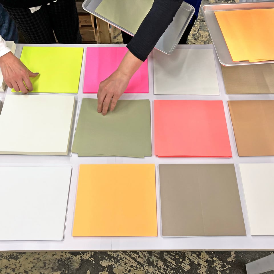 そして、準備が整うと、今度、工場で作業を行っていたスタッフの方に声をかけて、10人いっぺんに「DIY TRAVELER’S notebook!」を試してもらう。そのときは、みんな紙やノートが好きな一人のお客さんとなって、楽しそうに紙を選んでくれた。紙を選んだら、今度は製本・断裁。15分で何冊できそうか。実際にイベントではもっと紙の種類を増やすから、選ぶのにももう少し時間が増える前提で考えよう。そういえば、あの紙もあった方がいいかも。なんて、ことを考えながら、イベントの流れや詳細を考えていく。